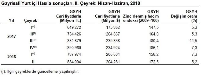 Üretim yöntemiyle Gayrisafi Yurt içi Hasıla tahmini, 2018 yılının ikinci çeyreğinde cari fiyatlarla %20,4 artarak 884 milyar 4 milyon 260 bin TL oldu.