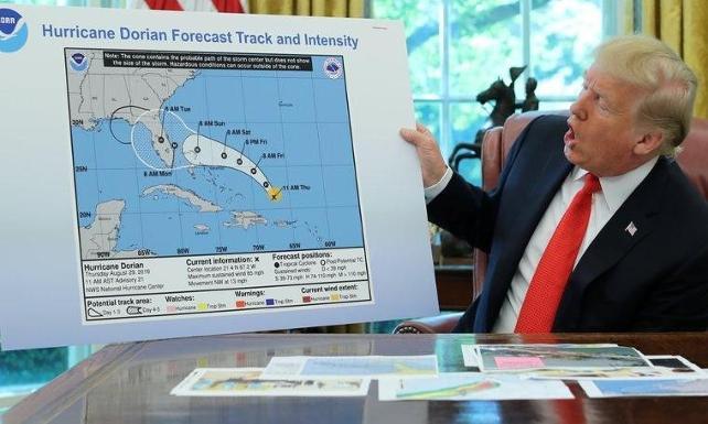 ABD Başkanı Donald Trump, Beyaz Saray’daki bir brifingde, Dorian Kasırgası’nın Alabama eyaletini de vuracağı iddiasını haklı çıkarmak için tahrip edilmiş “sahte” bir harita gösterdi.