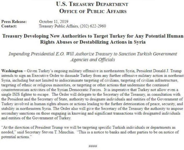“Türkiye’nin Suriye’nin kuzeydoğusunda süren askeri operasyonu ışığında, Başkan Donald J. Trump, Türkiye’yi kuzeydoğu Suriye’de, sivilleri, sivil altyapıyı, dini ve etnik azınlıkları hedef alan ve/veya Suriye Demokratik Güçleri’nin ‘terörle mücadele’ etkinliğini hedef alan ya da baltalayan –ve bunlarla da sınırlı olmayan- taarruza dönük daha fazla askeri eyleme girişmekten caydırmak üzere bir Başkanlık Kararnamesi imzalamak niyetindedir. Türkiye’nin tek bir IŞİD savaşçısının dahi kaçmasına izin vermemeye mecburdur.