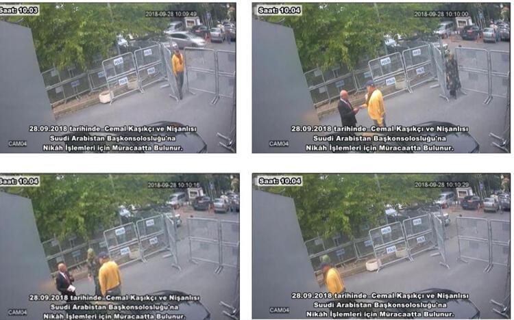 İddianamede, Kaşıkçı’nın evlilik işlemleri için gerekli belgeyi almak için nişanlısı Hatice Cengiz ile ilk olarak 28 Eylül 2018’de konsolosluğa gittiği ve daha sonra olay tarihi olan 2 Ekim 2018’de gidişine ilişkin kamera görüntüleri iddianamede yer aldı. Ayrıca 1-2 Ekim 2018 tarihlerinde ülkemize özel jet veya tarifeli uçaklarla giriş-çıkış yapan, Kağıthane ve Şişli’de bulunan iki otelde konaklayan 15 şüphelinin Atatürk Havalimanı’ndan girişleri, konsolosluğa yakın otellerde konaklamaları, otelden çıkış yaparak konsolosluk binasına, konutuna giriş-çıkış yapmaları, daha sonra havalimanından ayrılmalarına ilişkin kamera görüntülerine de iddianamede yer verildi.