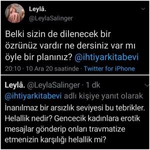 İfşa edilenler arasında yazar İbrahim Çolak da vardı. Leyla Salinger isimli kullanıcının kendisine “Belki sizin de dilenecek bir özrünüz vardır. Ne dersiniz var mı öyle bir planınız?” sorusuna karşılık veren Çolak, Salinger’e “Elbette ki üzüp incittiğim, özrün ötesinde helalleşmek istediğim insanlar var” dedi.