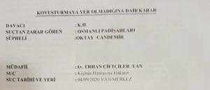 Gazeteci Oktay Candemir’in, attığı bir tweet gerekçesiyle evi arandı, bilgisayarına, harddiskine el konuldu, bir gün gözaltında kaldı, “kişinin hatırasına hakaret” suçlamasıyla çıkarıldığı mahkemece adli kontrol ile serbest bırakıldı, 15 gün boyunca karakola gidip imza attı, savcılık kovuşturmaya yer olmadığı kararını verdi. Candemir hâlâ bilgisayarına ulaşamazken savcılık kararında suçtan zarar gören kişiler olarak “Osmanlı padişahları” yazdığı … “’Osmanlı padişahları’nın hatırasına hakaret” gerekçesiyle evi aranan, gözaltında kalan gazeteci Oktay Candemir: “Hakkımdaki suçlamayı duyunca beni bir gülme tuttu” okumayı sürdür