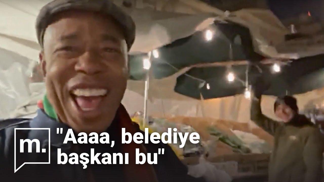 Adams’ın konuşmasının ardından videodaki Türk manavların birbirlerine “Belediye başkanı bu abi biliyorsun değil mi?” dediği ve karşısındaki tezgahta bulunan manavın ise “Aaa!” diyerek yanıt verdiği duyuluyor.