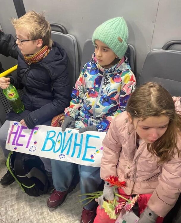 “Putin çocuklarla savaşta. Hem füzelerinin anaokullarını ve yetimhaneleri vurduğu Ukrayna’da hem de Rusya’da. Yedi yaşlarındaki David ve Sofya, dokuz yaşındaki Matyev, ve 11 yaşlarındaki Goşa ile Liza “SAVAŞA HAYIR” pankartları sebebiyle geceyi parmaklıklar ardında geçirdi.”