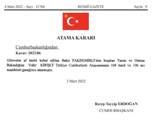 Kararda, “Görevden af talebi kabul edilen Bekir Pakdemirli’den boşalan Tarım ve Orman Bakanlığı’na Vahit Kirişci Türkiye Cumhuriyeti Anayasası’nın 104. ve 106. maddeleri gereğince atanmıştır” denildi.