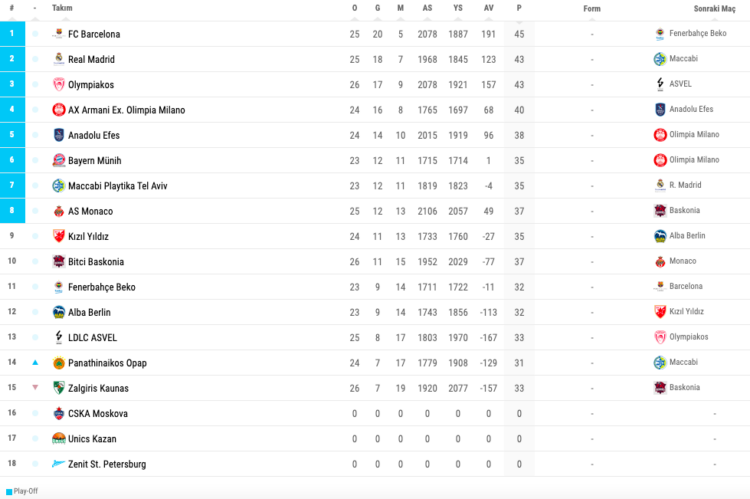 Turkish Airlines EuroLeague’de 31. haftanın ardından puan durumu: