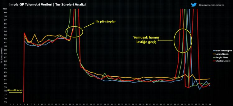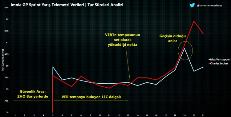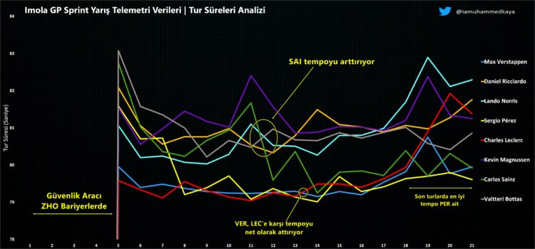 Son turlara girerken Verstappen, sonunda Ferrari’nin DRS aralığını aşıp ana düzlükte yarım saniye kazanarak Leclerc’i takibe aldı. Verstappen, rakibine baskı yapmaya başladı ve sonunda DRS ile start düzlüğünde burun buruna geldi. Ardından Tamburello‘da liderliği ele geçirdi. Ardından tempoyu artırarak farkı da açtı. Red Bull, bu seansta Ferrari’den üstün tempoya sahipti ve Max Verstappen gerekeni yaptı