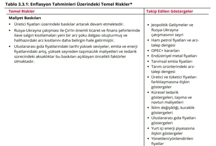 Enflasyon tahminleri üzerindeki temel riskler, maliyet baskıları, finansal piyasalar ve küresel makroekonomik belirsizlikler, jeopolitik riskler ve salgın, enflasyon beklentilerinin yüksek seyri ile para, maliye ve finansal politikaların eşgüdümü başlıkları altında sıralandı. Kavcıoğlu, yüksek enflasyon tahminini ve tahminde riskleri açıklarken, sık sık Rusya-Ukrayna arasındaki çatışmaya, gıda ve enerji ürünleri başta olmak üzere küresel emtia fiyatlarındaki artış gibi dışsal gerekçelere vurgu yaptı.