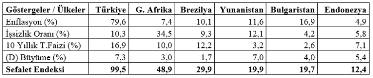 Sefalet endeksi karşılaştırması yapıldığında Türkiye’nin, Güney Afrika’yı ikiye Brezilya’yı da üçe katladığı görülüyor. Altı ülke arasında bu değerlendirme açısından en iyi durumda olan ülke Endonezya’dır. Öte yandan ağır bir ekonomik krizden çıkan Yunanistan’ın ciddi bir toparlanma içinde olduğu görülüyor.