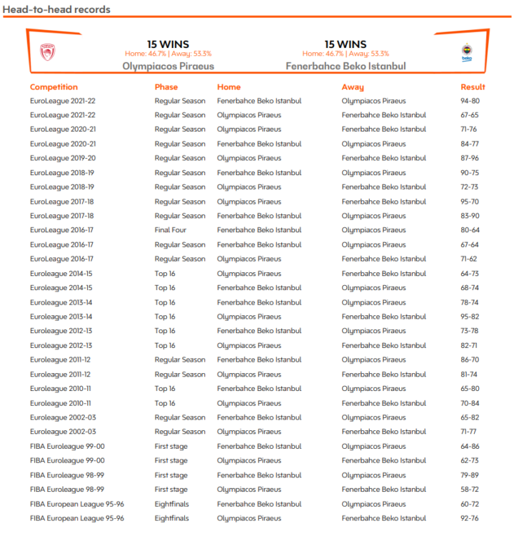 İki takım arasında bugüne kadar oynanan 30 karşılaşmada 15-15’lik eşitlik bulunuyor. Geçten sezonki randevularda her iki takım da evindeki karşılaşmadan galip ayrılmıştı. İstanbul’da oynanan karşılaşmada Fenerbahçe Beko, 94-80’lik skorla galip gelirken, Pire’de oynanan karşılaşmayı da 67-65’lik skorla kırmızı-beyazlılar kazanmıştı.