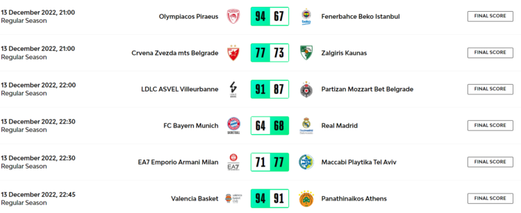 Turkish Airlines EuroLeague’de dün oynanan karşılaşmalarda alınan sonuçlar: