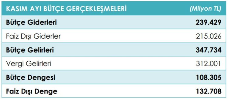 Hazine ve Maliye Bakanlığı, kasım ayı bütçe gerçekleşmeleri raporunu açıkladı. Merkezi yönetim bütçesi, ekimde 83,3 milyar TL açık verirken, kasımda 108,3 milyar TL fazla verdi. Bütçe fazlası bu ay, 32 milyar TL olan Kasım 2021’e göre yüzde 238,5 arttı. Bütçe giderleri Kasım 2021’e göre yüzde 76,4 artarak 239,4 milyar TL olurken, bütçe gelirleri yüzde 107,3 artışla 347,7 milyar TL oldu.