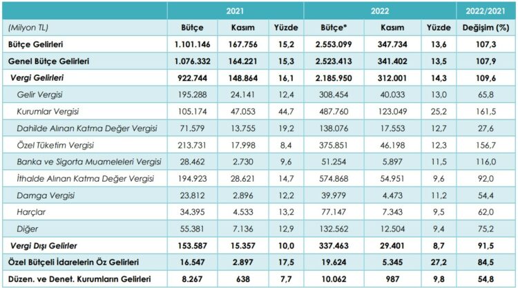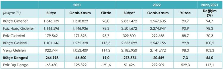 Ocak-kasım döneminde, 2022 yılının tamamı için, bütçe kanunu ve ek bütçe kanunu ile belirlenen bütçe giderlerinin yüzde 90,7’si harcanırken, tahmin edilen bütçe gelirlerinin yüzde 99,8’si elde edildi. Yılın ilk 10 ayında 128,8 milyar TL olan bütçe açığı, 11. ayda 20,4 milyar TL’ye geriledi. Bütçe açığı, geçen yılın aynı döneminde 46,5 milyar TL iken, 2022’de yüzde 56 azaldı.