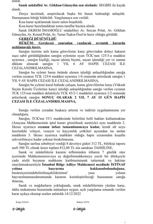 İBB Başkanı Ekrem İmamoğlu hakkında verilen iki yıl yedi ay 15 gün hapis ve siyasi yasak cezasının karar metninde maddi hata yapıldı. Karar metninde, “TCK 125/6 maddesi uyarınca” ibaresi yer alıyor ancak Türk Ceza Kanunu’nun (TCK) 125. maddesi 5 fıkradan oluşuyor.