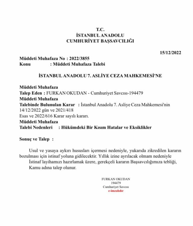 Kararı veren İstanbul Anadolu 7. Asliye Ceza Mahkemesi’ne dilekçe veren savcı Furkan Okudan, “Usul veya yasaya aykırı hususları içermesi nedeniyle, zikredilen kararın bozulması için istinaf yoluna gidilecektir” dedi.