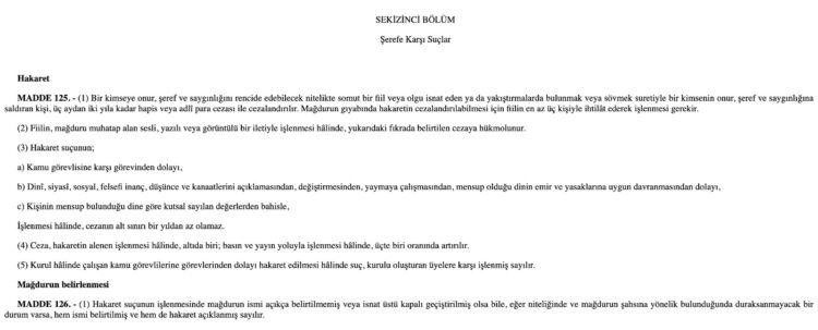 Türkiye Büyük Millet Meclisi’nin (TBMM) sitesinde de yer alan bilgiye göre, hakaret suçlarında 125/6 diye bir madde bulunmuyor.