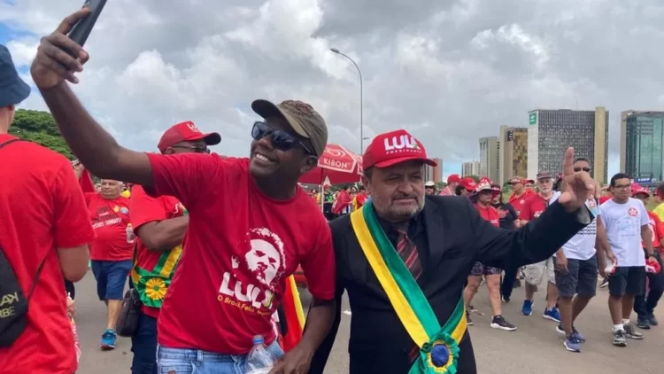 Törenin düzenleneceği alana girmek isteyen Lula destekçileri İşçi Partisi’nin kırmızı rengine büründü ve hatta bir Lula destekçisi başkanlık kuşağı bile taktı.