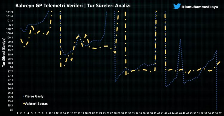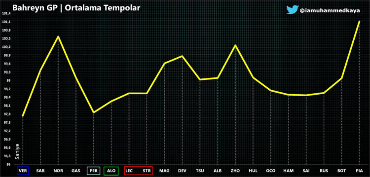 Tempo grafiğine de baktığımızda pistte kaldığı süre boyunca Verstappen’den yaklaşık 2 saniye daha yavaş turlar atan Leclerc için bu sezon da pek iyi geçmeyebilir. Geçtiğimiz sezon dayanıklılık sorunu yaşayan ekip için üstüne gidilmesi gereken en önemli mesele dayanıklılık iken henüz yarış başlamadan yapılan enerji ünitesi değişimi aslında gidilecek yolu az çok gösterdi. Tüm göstergeler negatif bir etki yarattı.