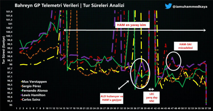 Charles Leclerc’in yarış dışı kalması avantaj sağladı. Fernando Alonso’nun temposu Lewis Hamilton’dan 0,23 saniye; Charles Leclerc’ten 0,31 saniye daha iyiydi. Fernando Alonso, içinde bulunduğu makine ne olursa olsun başarılı ancak AMR23’te ekstra rahat görünüyordu. Temposu ile hem Sainz hem de Hamilton’u rahatlık ile geride bıraktı.