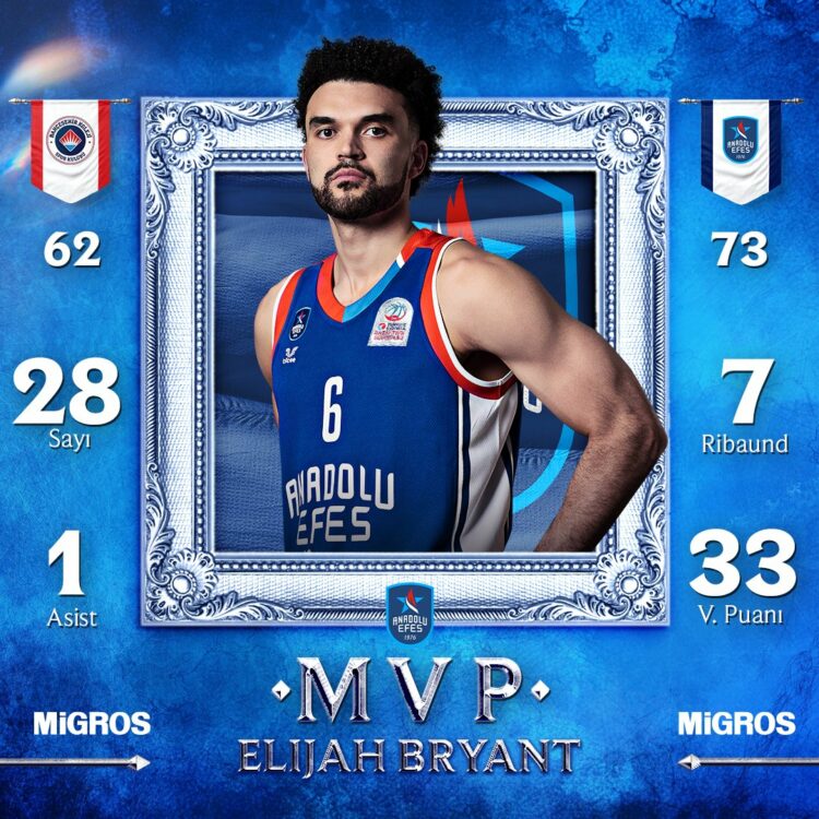 Anadolu Efes, Bahçeşehir Koleji deplasmanında 73-62’lik skorla galip gelirken, Elijah Bryant 4/4 üçlükle toplamda 10/13 saha içi isabetiyle, 28 sayı, 7 ribaund, 1 asist ve 1 top çalma ile galibiyeti getiren isim oldu.