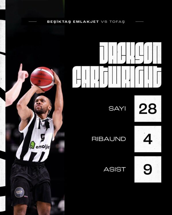 Beşiktaş Emlakjet’in yıldızı Parker Jackson-Cartwright, Tofaş karşısında alınan galibiyette, 28 sayı, 4 ribaund, 9 asist ve 6 top çalma istatistikleri ile toplam 41 verimlilik puanı üreterek haftaya damgasını vurdu.