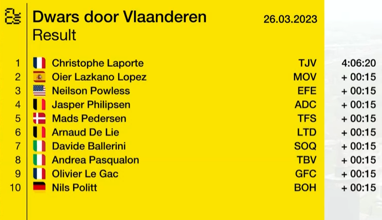 Bisiklet sporunda Flandre Klasikleri adı verilen tek günlük yol bisikleti yarışı Dwars door Vlaanderen 2023’te Jumbo-Visma takımından 30 yaşındaki Fransız bisikletçi Christophe Laporte şampiyon oldu. Geçen hafta sonu Gent-Wevelgem’de de şampiyonluğa ulaşarak kariyerinin ilk zaferini elde eden Laporte, dört gün içinde ikinci klasik zaferini elde etti.