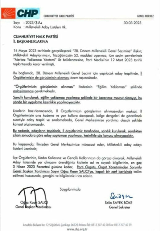 CHP, milletvekili listelerinin belirlenmesinde Kemal Kılıçdaroğlu’na tam yetki vermişti. Ancak yine de örgütler konuya ilişkin görüşlerini belirtiyor. Öneriler için bugün (3 Nisan) son gün olarak belirlendi. Ayrıca sekiz ayrı bölgede, genel başkan yardımcıları giderek teşkilatla, aday adaylarıyla görüşerek “Temayül yoklaması” yaptı. CHP Merkez Yönetim Kurulu, konuyu bugün gündemine aldı. CHP Genel Merkezi’nden il başkanlıklarına geçen hafta gönderilen yazıda, listeler konusunda kararı Kılıçdaroğlu’nun vereceğini hatırlatarak, “’Örgütlerimizin görüşlerinin alınması’ ifadesinin ‘eğilim yoklaması’ şeklinde anlaşılmaması gerekmektedir. Sandık konularak, eğitim yoklaması yapılması şeklinde bir kararımız mevcut olmayıp, bu yönde bir uygulama kesinlikle yapılmayacaktır” uyarısında bulundu.