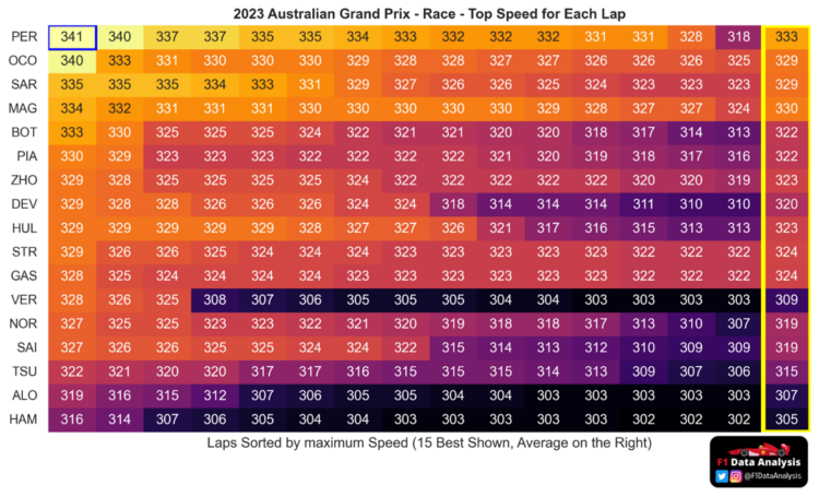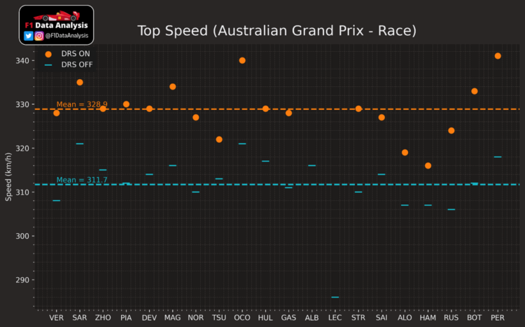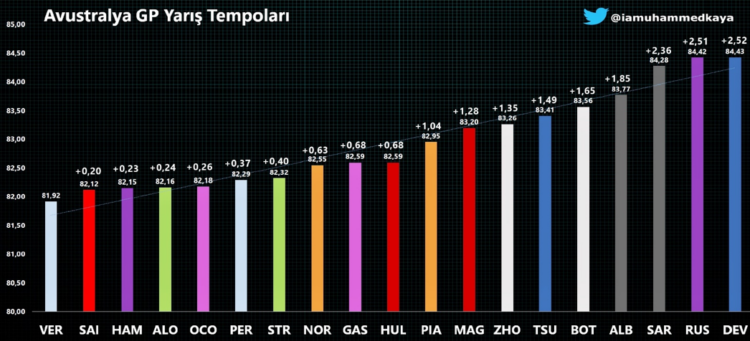 Carlos Sainz ilginç şekilde en hızlı tempoya sahip ikinci pilot olurken (Verstappen, +0,20) Lewis Hamilton, Fernando Alonso gibi podyuma çıkan isimleri de geride bıraktı ancak puan alamadı. Charles Leclerc ise henüz yarışın başında çakıllara girerek yarış dışı kaldı.