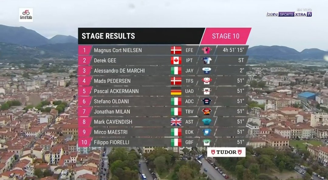 2023 İtalya Bisiklet Turu’nun Scandiano-Viareggio arasında koşulan 196 kilometre uzunluğundaki 10. etabını, EF-Education Easypost takımından 30 yaşındaki Danimarkalı bisikletçi Magnus Cort Nielsen kazandı. Üçlü kaçış grubundaki atağıyla zafere giden Nielsen’in ardından Israel-Premier Tech takımından 25 yaşındaki Kanadalı bisikletçi Derek Gee ikinci sırayı alırken, Jayco-Alula takımından 36 yaşındaki İtalyan bisikletçi Alessandro De Marchi üçüncülüğü elde etti. Genel klasman lideri Ineos Grenadiers takımından 36 yaşındaki Galli bisikletçi Geraint Thomas, 51 saniyelik farkla etabı 22. sırada tamamlamasına rağmen zirvedeki yerini korudu.