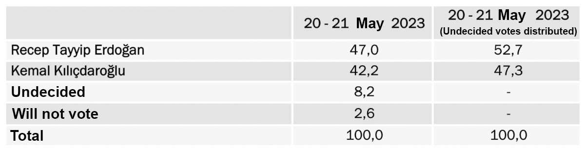 KONDA’s original predictions prior to May 14 had projected Kılıçdaroğlu leading with some 49.3% to Erdoğan’s 43.7%, putting the opposition leader just shy of a first round victory.