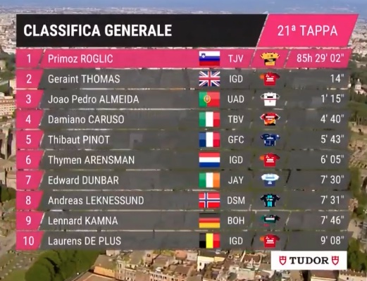 Jumbo-Visma takımından 33 yaşındaki Sloven bisikletçi Primoz Roglic ise 2023 İtalya Bisiklet Turu’nu genel klasman şampiyonu olarak tamamladı. Roglic, kazandığı 3 İspanya Bisiklet Turu’nun ardından Fransa ve İtalya’da yaşadığı hayal kırıklıkları sonrasında, en sonunda İtalya Bisiklet Turu şampiyonluğunu da hanesine yazdırdı.