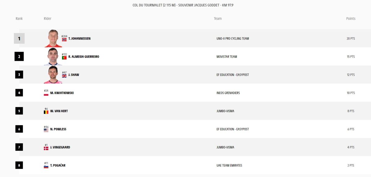 47 kilometre kala: Johannessen Turmalet zirvesini ilk sırada geçerek maksimum puanı hanesine yazdırıyor.
