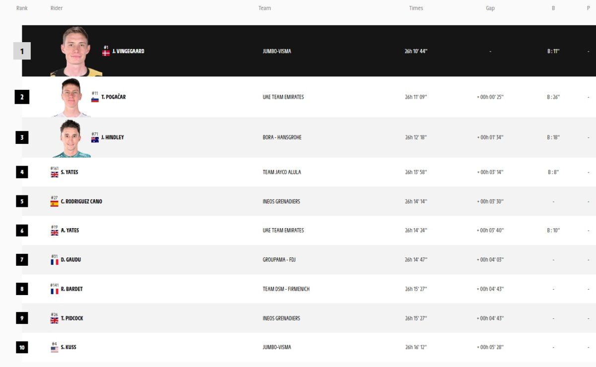 Son kilometre: Tadej Pogacar sarı mayoyu ele geçirebilecek kadar zaman farkı açamasa da, 24 saniyelik farkla etap galibiyetine giderek, kariyerinin 10. Fransa Bisiklet Turu etabını hanesine yazdırıyor. Vingegaard 24 saniyelik farkla ikinci sırayı ve aynı zaman da sarı mayoyu alıyor.