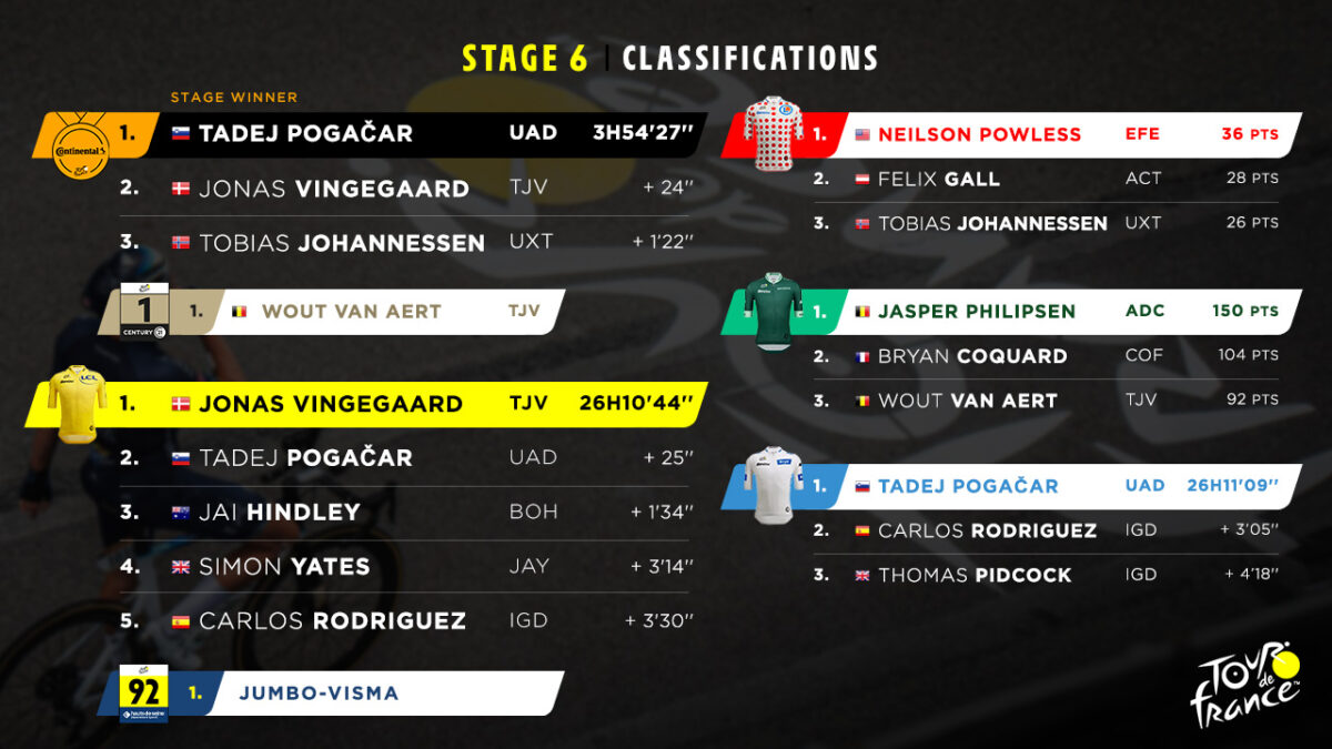 2023 Fransa Bisiklet Turu’nun Tarbes-Cauterets-Cambasque arasında koşulan 114.9 kilometre uzunluğundaki altıncı etabını, UAE Team Emirates takımından 24 yaşındaki Sloven bisikletçi Tadej Pogacar kazandı. Pogacar’ın ardından 24 saniyelik farkla etap ikinciliğini elde eden, Jumbo-Visma takımından 26 yaşındaki Danimarkalı bisikletçi Jonas Vingegaard genel klasmanda da liderlik koltuğuna oturdu. Uno-X takımından 23 yaşındaki Norveçli bisikletçi Tobias Halland Johannessen ise 1:22 saniyelik farkla üçüncü oldu.