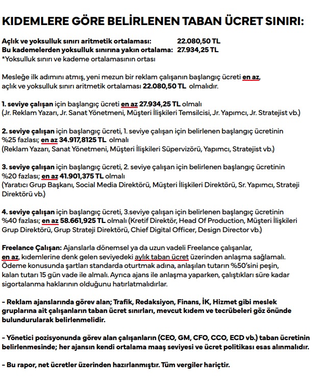 Reklamcılar Platformu, Temmuz ayı için “Taban Ücret Politikası” açıkladı. Reklam sektöründe ilk kez ücret politikası yayımlanmış oldu. Rapora göre, yeni mezun bir reklam çalışanının ücreti en az 22 bin 80 Türk Lirası olmalı. Medyascope‘a konuşan Reklamcılar Platformu Eş Başkanı Yiğit Uysal, reklam sektöründe çalışanların yıllar içinde büyük kayıplar yaşadığını belirterek, “Tablo tavsiye niteliği taşımakla birlikte gerçeğin ilanı gibi. İlk amacımız bu geri kalmış payı kapatmak” dedi.