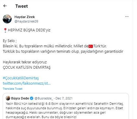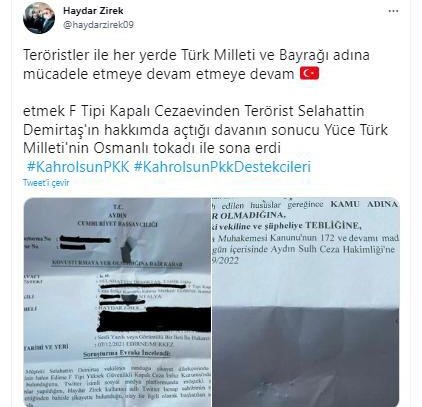 Aydın’da yaşayan Haydar Zirek adlı bir Twitter kullanıcısı 7 Aralık 2021 tarihindeki bir paylaşımda,“Haykırarak tekrar ediyoruz, çocuk katilisin Demirtaş” diye yazdı. Bunun üzerine Demirtaş’ın avukatları, söz konusu Twitter kullanıcısı hakkında Aydın Cumhuriyet Başsavcılığı’na suç duyurusunda bulundu.