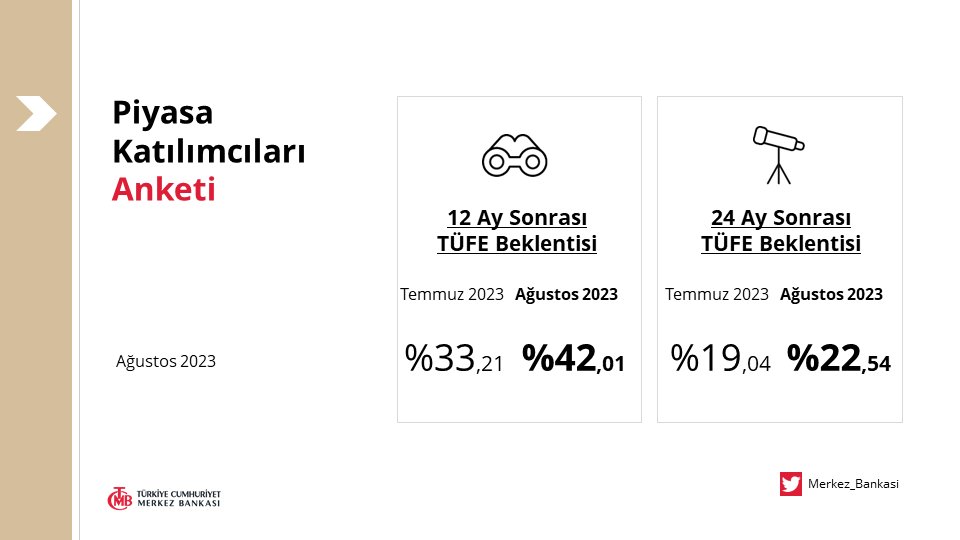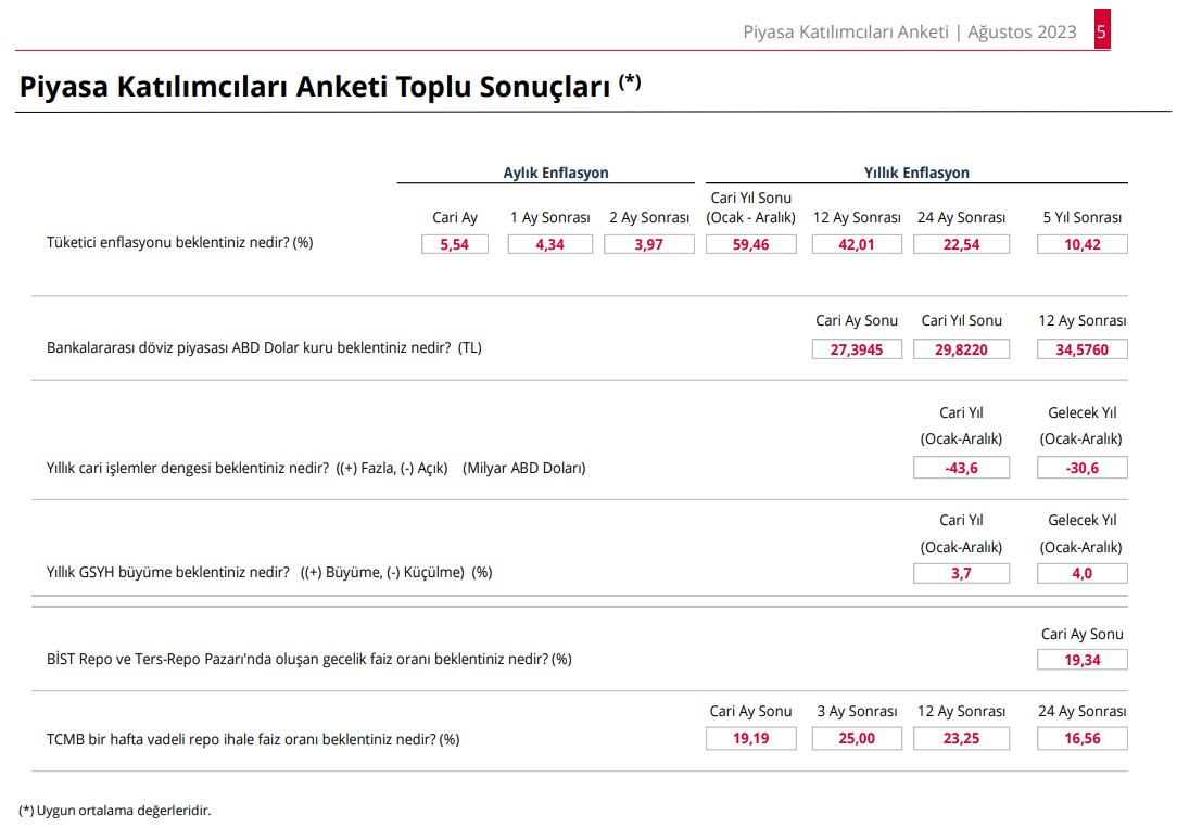 2023 yılının üçüncü enflasyon raporu sunumunda, TCMB Başkanı Hafize Gaye Erkan, bir önceki toplantıda yüzde 22,3 olan 2023 yıl sonu enflasyon tahminlerini, yüzde 58’e çıkardıklarını açıklamıştı. TCMB’nin enflasyon beklentisi 2024 yılı sonunda yüzde 33 ve 2025 yılı sonunda yüzde 15 olmuştu. 27 Temmuz’da yapılan toplantının ardından yapılan ilk ankette, piyasa katılımcılarının beklentileri TCMB’nin tahminlerine göre şekillendi.
