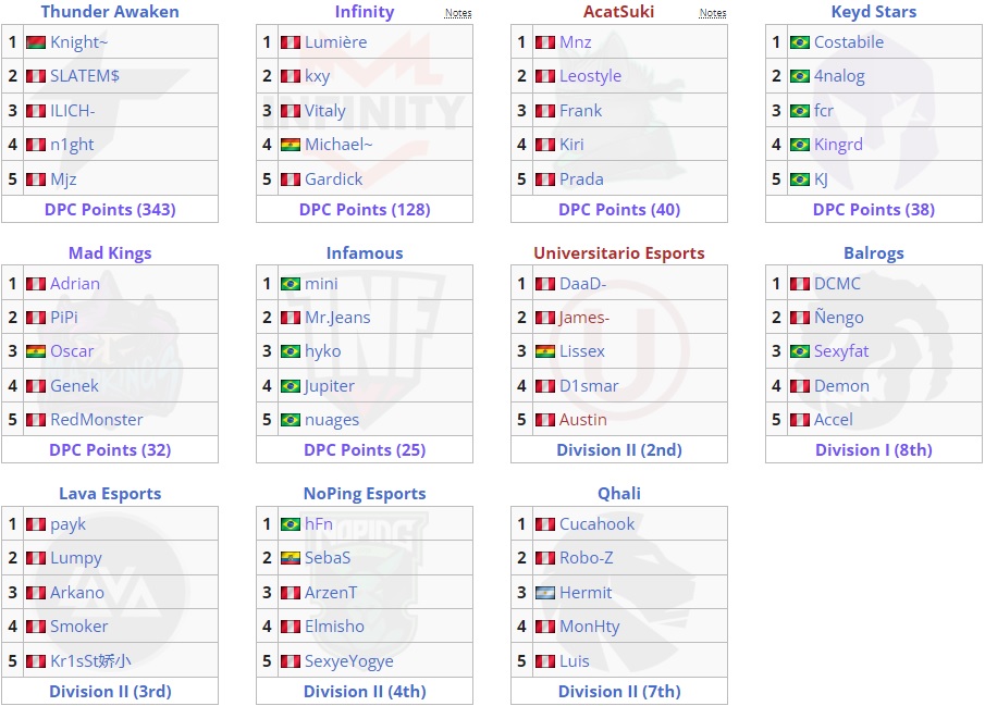 Bölgenin lokomotif takımı Beastcoast’un yanına eski ismiyle Thunder Awaken, yeni ismiyle Evil Geniuses’ın da eklenmesiyle Güney Amerika daha çok dikkat çeken bölgelerden biri oldu. Birkaç sene öncesine kadar hiçbir takımının varlık gösteremediği bir bölgeden bahsediyoruz. Beastcoast ve Evil Geniuses, sene içinde gösterdiği performanslar sayesinde TI 12 için DPC sıralamasında ilk 12’de yer alarak elemelere katılmadan bileti kaptı. Geri kalan takımlarda gözümüze 3 tane takım çarpıyor. Bunlardan ilki Thunder Awaken. İkinci ve Üçüncü Major Elemelerinde 3.sıradaki yerini koruyan Thunder Awaken, herhangi bir Major’a katılamasa da TI 12 biletini almaya hiç bu kadar yakın olmamıştı. Kadroda 4 tane Perulu, 1 tane de Beyaz Rus oyuncu bulunduran Thunder Awaken’da Hard Support(Position 5/Pos 5) oynayan kaptan Mjz dışında TI tecrübesi bulunan bir oyuncu yok. Diğer bir takım ise Infinity tarafından Hokori’den transfer edilen ekip. Takımda Lumiere, Vitaly ve Gardick geçen sene TI tecrübesi yaşadılar. Pek bir varlık gösteremeseler bile Grup Aşamasında dikkat çeken bir performans göstermişlerdi. Diğer oyuncular kxy ve Michael ise ilk defa TI’a katılmak için uğraşacaklar. Dikkat çeken bir diğer takım ise eski Infinity takımı. AcatSuki ismiyle elemelere katılıyorlar. Kadronun Core ekibi Mnz, LeoStyle ve Frank, TI 2021’e katılma başarısı elde etmişlerdi. Support ekibi Kiri ve Prada ise ilk defa TI rüyasına bu yakınlaşıyorlar. Bu 3 takımın dışında şansları az olsa bile imkansız diyemeyeceğimiz Brezilya takımı Keyd Stars, Mad Kings, Infamous ve NoPing Esports dikkat çeken takımlardan.