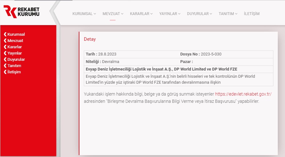 İşlemlerin tamamlanmasının ardından DP World, Evyap Limanı’nın yüzde 58’ine, Evyap Grubu ise DP World Yarımca’nın yüzde 42’sine sahip olacak. Yeni işletme DP World Evyap olarak adlandırılacak. Süreç hakkında Rekabet Kurumu’nun değerlendirmesi devam etmektedir.”