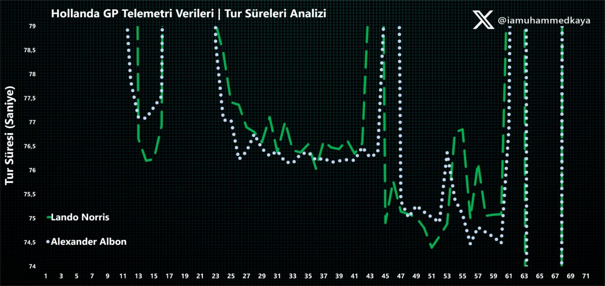 Özellikle ilk yağmur esnasında takımın stratejiye karar verememesi ekibe oldukça pahalıya patladı. Lando Norris de bu duruma telsiz mesajı ile isyan etti. Oscar Piastri’nin performansı da pek tatmin edici olmayınca olası puanları kaybetmek kaçınılmaz oldu. Lando Norris yarış içerisinde iyi işler çıkaran Alex Albon ile sık sık karşılaştı. Lando Norris, Albon’u arkasında tutmayı başardı ancak Piastri başaramadı. Yarış temposunda da Albon Piastri’den 0,33 saniye daha hızlı idi.