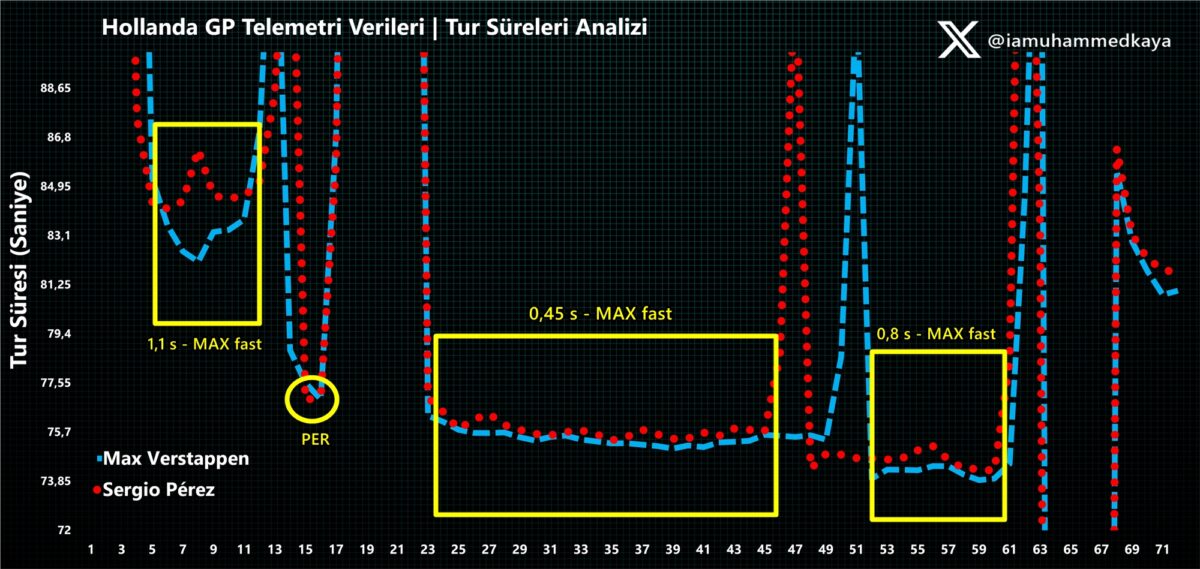 İlk yağmur lastikleri stintinde 1,1 saniye daha hızlı turlar atan Verstappen, Perez’i her yeni lastik tercihinde performans olarak geride bıraktı. Genel tempoda da takım arkadaşından 0,6 saniye daha hızlı idi. Kusursuz.