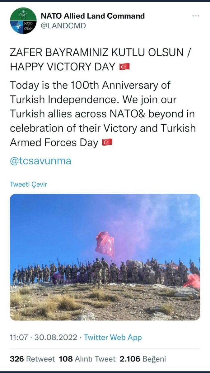 NATO Müttefik Kara Komutanlığı (LANDCOM), 30 Ağustos Zafer Bayramı’nın 101. yılını kutlayan bir paylaşım yaptı. LANDCOM’un Twitter hesabından paylaşılan mesajda Türkçe olarak, “Zafer bayramınız kutlu olsun” denildi.