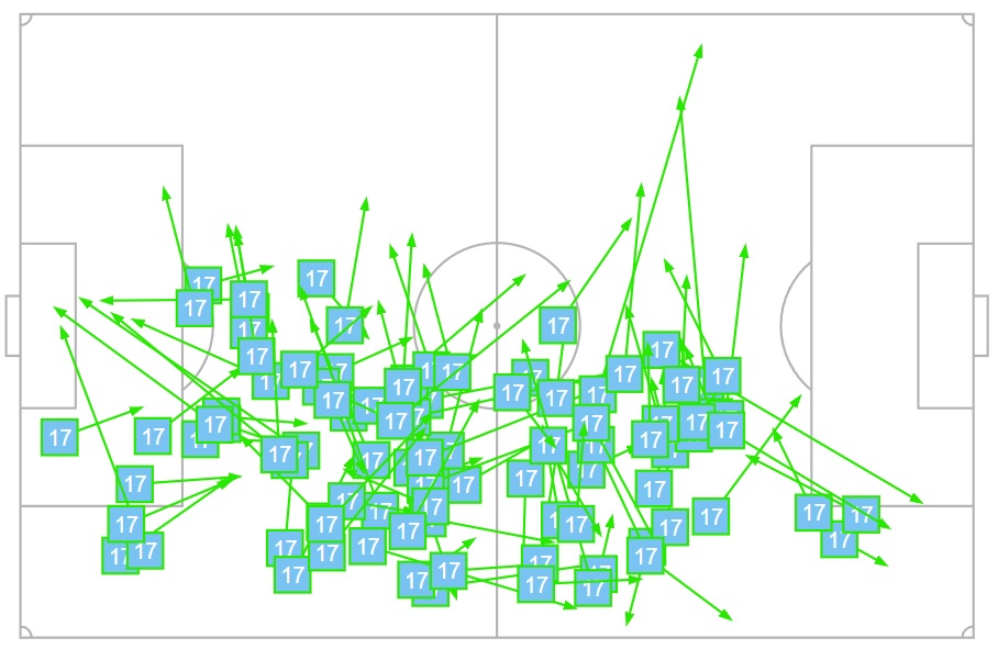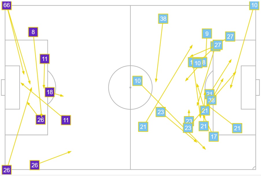 xG grafiğinde ise Tottenham’ın dakika 75-80’den sonra dramatik bir artışı söz konusu. Giderek risk alınmaya başlanan dakikalarda bu tip artışlar görülmesi normal. Buna rağmen ikinci yarı boyunca Tottenham’ın %100 sayılacak bir gol pozisyonuna girememesi onlar adına can sıkıcı. Son’un sakat bir şekilde oynaması, sonra da çıkmak zorunda kalması Tottenham’ın hücum planını ciddi anlamda etkiliyor. Maddison-Son-Kulusevski üçlüsünün ne kadar büyük bir tehlike olduğuna her hafta tekrardan şahitlik etmeye devam ediyoruz. Son yine golünü attı, Maddison yine akıl dolu ara paslarla arkadaşlarını pozisyona soktu. Son’un iptal edilen golünde Richarlison’a attığı ara pas inanılmazdı. Saha görüşüyle her maçta fark yaratan bir oyuncu oluyor. Kulusevski ise 5 kilit pas atarak en verimli maçlarından birini oynadı. Karşı alana taşınan toplarda 15 gol fırsatı yaratarak zirveyi Brighton’lı Mitoma ile paylaşıyor. Bunların 11’ini de kilit pasla sonuçlandırarak bu alanda Premier Lig’in zirvesinde. Maddison ise 13 gol fırsatı yarattı, bunların 6’sı kendi taşıdığı topların sonunda attığı kilit paslar ve 3’ü de asiste dönüştü. Maddison’da ileriye taşıdığı topları en çok asiste çeviren oyuncu sıralamasında zirvede yer alıyor. Maç başına en fazla top taşıyan Tottenham’lı oyuncu ise Bissouma’dan başkası değil. Orta sahalar arasında Rodri ve Bernardo Silva’dan sonra üçüncü sırada. Bu da Bissouma’nın Tottenham’ın oyun kurulumu konusundaki önemini bizlere gösteriyor.
