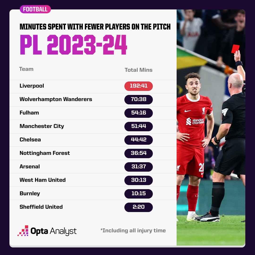 Kabul etmemiz gereken bir şey daha var. O da bu sene gerçekten Liverpool’da bir disiplin probleminin varlığı. 2011-2012 sezonundaki 5 kırmızı karttan beri bu sayılara hiç yaklaşmamışlardı. Bu sene ise Eylül ayını 4 kırmızı kartla kapatmış oldular. Kırmızı kartların doğruluğu tartışılır ama takımın gereğinden fazla sert oynadığını da görüyoruz. Bu arada görselde 3 yazıyor, görsel yayınlandığında Liverpool 10 kişiydi, bu detayı da atlamadan belirteyim. MacAllister, çok agresif oynuyor ki önceki haftalarda kırmızı kart görmüş bir oyuncu. Bu maçta da sarı kart aldı. Fazla riskli ve sert müdahalelerin Liverpool’u çok etkilediğini vurgulayalım. Umarım Klopp, bu konuda takımını uyarıyordur. 192 dakika eksik oynamak, oynanan 7 maçın 2’sinin 11 kişiyle oynanmadığını gösteriyor.