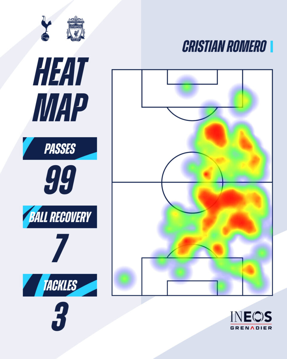 Şimdi gelelim maçın gizli kahramanları Pedro Porro ve Romero ikilisine. Pedro Porro her geçen hafta o kadar iyi bir performans sergiliyor ki ağzım açık kalıyor. Daha hücumcu bir bek görüntüsü vermesine rağmen bu maçta 6 top kaptı, 7 kez de orta açtı. 55 pas atarak da maçın en iyilerindendi. Matip’in kendi kalesine attığı golde topu içeri yollayan da Pedro Porro’dan başkası değildi. Bir diğer oyuncu ise Romero. Maç içerisinde ceza sahasına çok yakın oynamasına şaşırdığım Romero’nun istatistikleri beni çok şaşırttı. Neredeyse sahanın alt yarısında adım atmadık yer bırakmadı. Adeta Bissouma görevi gördüğü zamanlar bile gördük. Bu sezon en çok 80 pas yaptığı iki maç bulunan Romero, bu maçta tam 99 pas yaptı ve bunların %95’i isabetliydi.