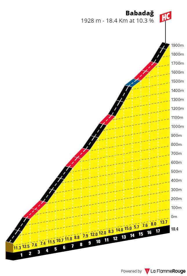 Büyük turları (La Vuelta-Giro d’İtalia-Tour de France) organize eden ASO’nun (Amaury Sport Organization) tırmanışlara zorluk derecesine göre verdiği puan formülüne göre, İspanya’nın en zorlu tırmanışı olan Angliru 1.223, Fransa’da kullanılan en zorlu tırmanışlardan biri olan Mont Ventoux 1.233 puan alıyor. İtalya’da kullanılan en zorlu tırmanış Monte Zoncolan ise 1.440 puan alıyor. Ancak 58. Cumhurbaşkanlığı Türkiye Bisiklet Turu’nun Fethiye-Babadağ üçüncü etabında kullanılan Babadağ tırmanış zirvesinin puanı ise 1.920 ve bu tırmanış, yol bisikleti sporunda kullanılan en zorlu tırmanışlar içerisinde, en yakın rakibinin bile 400 puanın üzerinde bir zorluğa sahip olan tırmanış olarak tarihe geçti.
