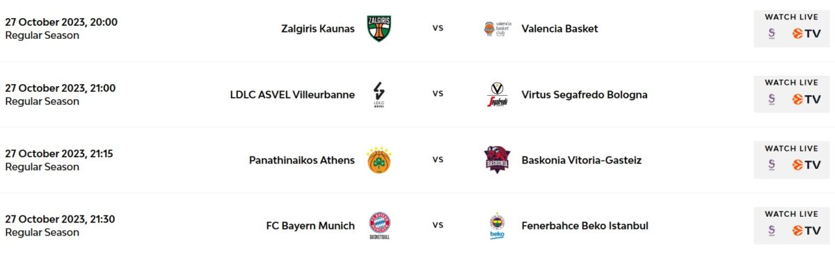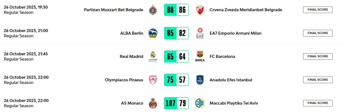 Turkish Airlines EuroLeague 2023/2024 sezonunda beşinci hafta heyecanı devam ediyor. Temsilcimiz Anadolu Efes, deplasmanda Olympiacos’a 75-57’lik skorla mağlup oldu. Haftanın açılış maçında ise Partizan Mozzart Bet, Belgrad derbisinde Kızılyıldız Meridianbet’i 88-86’lık skorla mağlup etti. El Clasico’da ise Real Madrid, evinde FC Barcelona’yı 65-64’lük skorla geçti. Temsilcimiz Fenerbahçe Beko ise bu akşam (27 Ekim) 21.30’da FC Bayern Münih deplasmanında sahaya çıkacak.