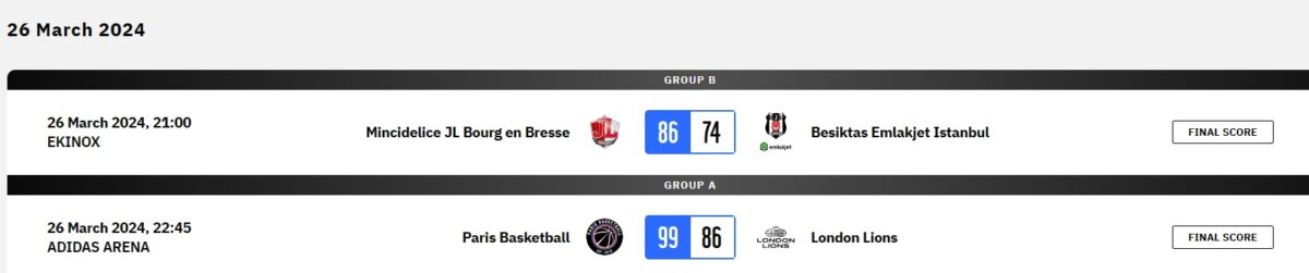 Mincidelice JL Bourg en Bresse’de Isiaha Mike 16 sayı ve 6 ribaund, Jequan Lewis 14 sayı ve 5 asist, Axel Julien 11 sayı, Bodian Massa 10 sayı ve 5 ribaund ve Bryce Brown da 10 sayı kaydetti. Beşiktaş Emlakjet’te ise Angel Delgado 15 sayı ve 16 ribaund, Marko Simonovic 14 sayı, Derek Needham 13 sayı ve 5 asist ve Matthew Mitchell da 10 sayı kaydetti.