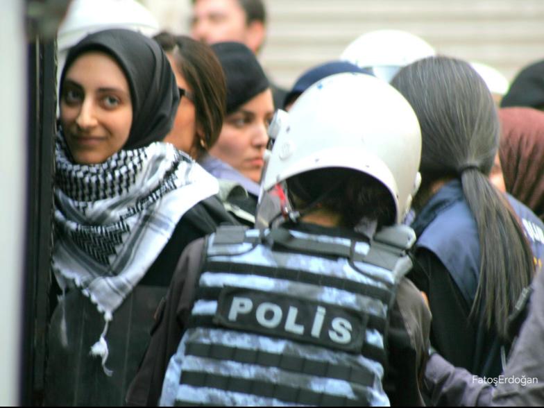 Nereye bağlı olduğu belli kadın polis amiri durup dururken eli kolu tutulmuş başörtülü genç bir kıza tekme tokat girişiyor