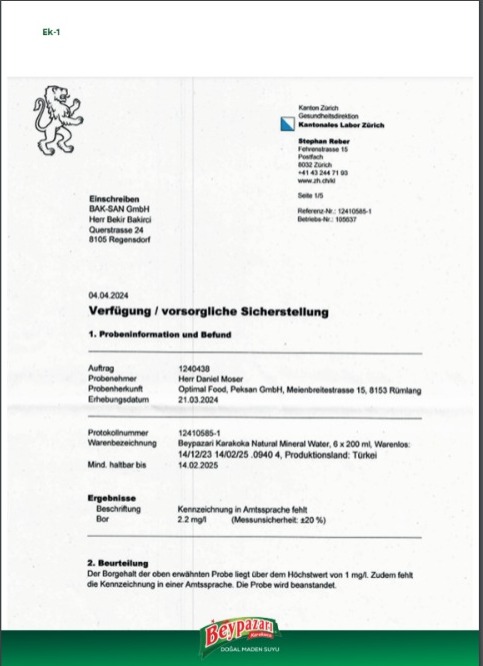 İsviçre Federal Gıda Güvenliği ve Veterinerlik İşleri Dairesi, Beypazarı marka maden sularında yüksek seviyede bor tespit edildiğini açıkladı. Dairenin yayımladığı duyuruda ürünün tüketilmesinin sağlık riskine yol açtığı söylendi ve İsviçre’de ürünü dağıtan BAK-SAN GmbH’nin ürünü toplatmaya başladığı belirtildi.